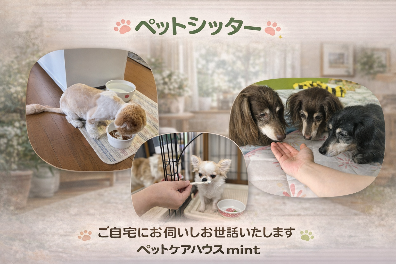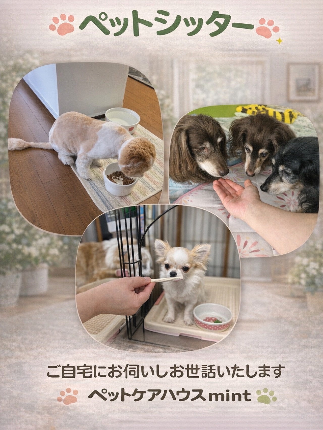 大阪府大東市を中心に、お留守番の必要になったワンちゃん・猫ちゃんを、ご自宅にお伺いしお世話させて頂きます。