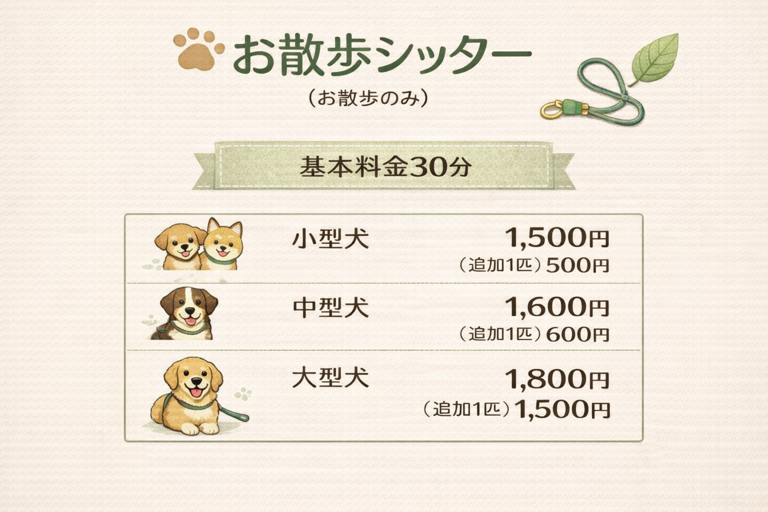 小中型犬▶︎2頭目1サービス毎に+1,500円